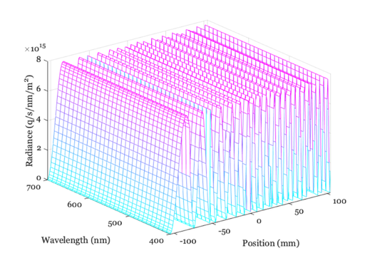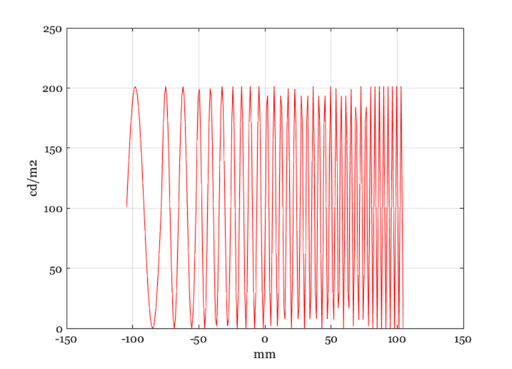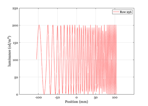 % There are many types of scenes. Here is a simple one that is % useful for demosaicing. For a list, type help sceneCreate sceneTest = sceneCreate('freq orient pattern'); sceneWindow(sceneTest); pause(0.2); % With this one, we might try some simple plots, such as a plot % of the luminance across the bottom row sz = sceneGet(sceneTest,'size'); scenePlot(sceneTest,'luminance hline',sz); % We can do this ourselves by getting the luminance of this % bottom row as follows luminance = sceneGet(sceneTest,'luminance'); data = luminance(sz(1),:); support = sceneSpatialSupport(sceneTest,'mm'); ieNewGraphWin; plot(support.x,data,'-'); xlabel('mm'); ylabel('cd/m2'); grid on rows = round(sceneGet(sceneTest,'rows')/2); assert(rows == 128,'Row test failed') scenePlot(sceneTest,'radiance hline',[1,rows]);