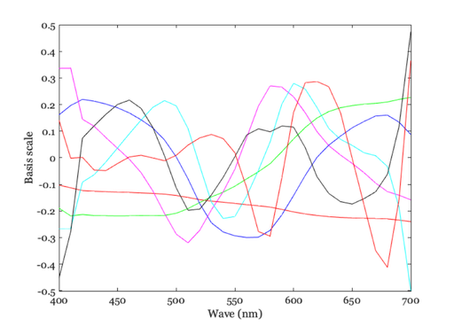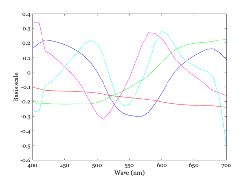 wave = sceneGet(scene,'wave'); reflectance = sceneGet(scene,'reflectance'); % Do not remove the mean, and require explaining 0.999 of the variance mType = 'canonical'; % The alternative is 'mean svd', which removes the mean first. bType = 0.999; [~, basisData,~,varExplained] = hcBasis(reflectance,bType,mType); fprintf('Variance explained %.03f by %d bases\n',... varExplained,size(basisData,2));