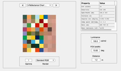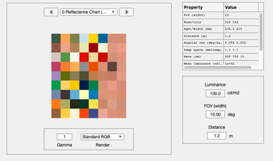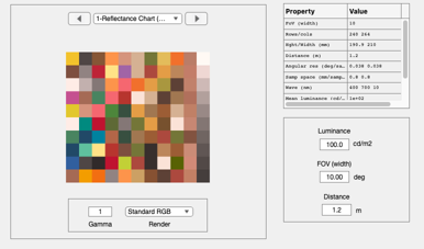 % The files containing the reflectances are in ISET format, readable by % s = ieReadSpectra(sFiles{1}); sFiles = cell(1,4); sFiles{1} = which('MunsellSamples_Vhrel.mat'); sFiles{2} = which('Food_Vhrel.mat'); sFiles{3} = which('DupontPaintChip_Vhrel.mat'); sFiles{4} = which('HyspexSkinReflectance.mat'); %{ sFiles{1} = fullfile(isetRootPath,'data','surfaces','reflectances','MunsellSamples_Vhrel.mat'); sFiles{2} = fullfile(isetRootPath,'data','surfaces','reflectances','Food_Vhrel.mat'); sFiles{3} = fullfile(isetRootPath,'data','surfaces','reflectances','DupontPaintChip_Vhrel.mat'); sFiles{4} = fullfile(isetRootPath,'data','surfaces','reflectances','HyspexSkinReflectance.mat'); %} % The number of samples from each of the data sets, respectively sSamples = [12,12,24,24]; % % How many row/col spatial samples in each patch (they are square) pSize = 24; % Patch size wave = []; % Whatever is in the reflectance data file grayFlag = 0; % No gray strip sampling = 'no replacement'; scene = sceneCreate('reflectance chart',pSize,sSamples,sFiles,wave,grayFlag,sampling); % The chart parameters are attached to the scene object sceneGet(scene,'chart parameters') % Show it on the screen ieAddObject(scene); sceneWindow;