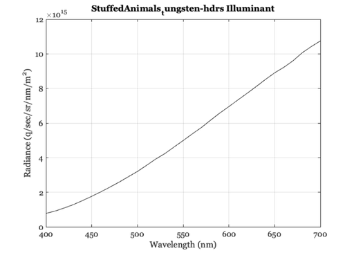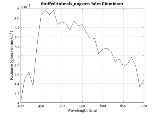 wList = [400:10:700]; fullFileName = fullfile(isetRootPath,'data','images','multispectral','StuffedAnimals_tungsten-hdrs.mat'); scene = sceneFromFile(fullFileName ,'multispectral',[],[],wList); % Have a look at the image (just mapping different spectral bands into rgb) ieAddObject(scene); sceneWindow; % Plot the illuminant scenePlot(scene,'illuminant photons roi')