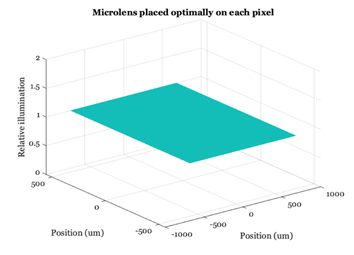 We analyze how to position microlenses with respect to the center of each pixel in order to optimize light gathering. If we create a microlens array for a particular optics (imaging lens also called the taking lens) and sensor, then we are analyzing where we should place each microlens.