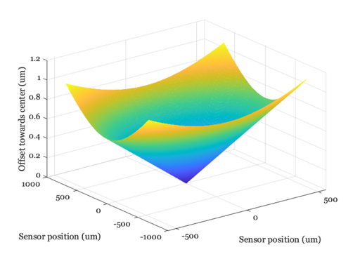 offsets = mlensGet(mlens,'optimal offsets',sensor); % Units are microns sSupport = sensorGet(sensor,'spatial support','um'); ieNewGraphWin; mesh(sSupport.y,sSupport.x,offsets); xlabel('Sensor position (um)'); ylabel('Sensor position (um)'); zlabel('Offset towards center (um)')