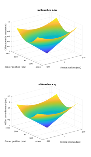 mlens0 = sensorGet(sensor,'microlens'); sSupport = sensorGet(sensor,'spatial support','um'); fnumber = mlensGet(mlens0,'ml fnumber'); mlens1 = mlensSet(mlens0,'ml fnumber',0.5*fnumber); mlens1 = mlensSet(mlens1,'name','Half fnumber'); ieNewGraphWin([],'tall'); offsets0 = mlensGet(mlens0,'optimal offsets'); % Units are microns subplot(2,1,1), mesh(sSupport.y,sSupport.x,offsets0); xlabel('Sensor position (um)'); ylabel('Sensor position (um)'); zlabel('Offset towards center (um)') title(sprintf('ml fnumber %.2f',mlensGet(mlens0,'ml fnumber'))); offsets1 = mlensGet(mlens1,'optimal offsets'); % Units are microns subplot(2,1,2), mesh(sSupport.y,sSupport.x,offsets1); xlabel('Sensor position (um)'); ylabel('Sensor position (um)'); zlabel('Offset towards center (um)'); title(sprintf('ml fnumber %.2f',mlensGet(mlens1,'ml fnumber'))); % How different is the largest offset (in um)? max(abs(offsets0(:) - offsets1(:)))