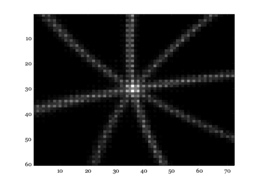 iSize = 128; nLines = 4; fov = 3; scene = sceneCreate('star pattern',iSize,'ee',nLines); scene = sceneSet(scene,'fov',fov); oi = oiCreate; % Create a sensor whose field of view matches the scene size sensor = sensorCreate; pixelSize = [1.4 1.4]*1e-6; % Pixel size of 1.4 um sensor = sensorSet(sensor,'pixel size constant fill factor',pixelSize); sensor = sensorSet(sensor,'fov',sceneGet(scene,'fov')/2,oi); sz = sensorGet(sensor,'size'); % Exposure time of the complete image (all rows). As we increase the % exposure time, the rotating line turns into a wedge. The width of the % wedge increases with exposure time. expTime = 1e-4; % Millisecond regime sensor = sensorSet(sensor,'exp time',expTime); % Read out time per row (should be microsecond range). % % The delay between reading the first and last row is % % perRow * (number of rows) % % At the end of this routine, we assemble the final image by assuming that % the reset time is delayed in the same way that the read out time is % delayed. This gives every row the same exposure duration, but the % acquisition period of each of the rows is delayed in time. % To see a bigger effect of the rolling shutter, make this number bigger. perRow = 10e-6; % How many total captures do we need? Number of rows plus enough additional % captures for last row nFrames = sz(1) + round(expTime/perRow); % Store the sensor volts from each capture separately, before we assemble. v = zeros(sz(1),sz(2),nFrames); % The number of degrees the rays rotate between each row capture (perRow). % The deg per second is rate/perRow or in total rotations per second % rate/perRow/360. The faster the rotation, the more the curvature. rate = 0.3; fprintf('Computing %i frames\nRotation rate: %.2f (cycles per sec)\n',nFrames,rate/perRow/360);