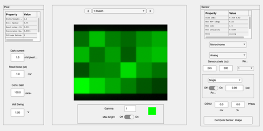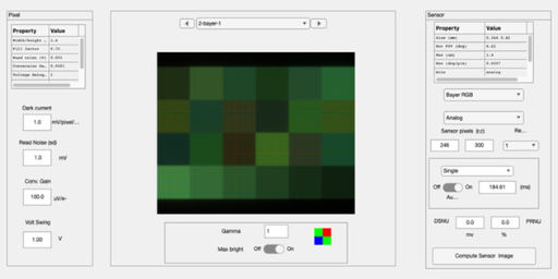 % Match a new sensor to the Foveon sensor properties sensorFoveon = sensorCreate; sensorFoveon = sensorSet(sensorFoveon,'name','foveon'); sensorFoveon = sensorSet(sensorFoveon,'pixel size constant fill factor',[1.4 1.4]*1e-6); sensorFoveon = sensorSet(sensorFoveon,'autoexp',1); sensorFoveon = sensorSetSizeToFOV(sensorFoveon,sceneGet(scene,'fov'),oi); sensorFoveon = sensorSet(sensorFoveon,'wave',wave); % Place the data (im) into the volts field of the matched sensor. The % sensor has the same properties as the monochrome sensor, but it has the % proper color filters. % Put the Foveon color filters here sensorFoveon = sensorSet(sensorFoveon,'filter spectra',fSpectra); sensorFoveon = sensorSet(sensorFoveon,'pattern',[2]); sensorPlot(sensorFoveon,'color filters'); % Put the Foveon simulation data here sensorFoveon = sensorSet(sensorFoveon,'volts',im); sensorWindow(sensorFoveon);