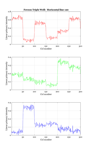 ip = ipCreate; ip = ipCompute(ip,sensorFoveon); ip = ipSet(ip,'name','Foveon Triple Well'); ipWindow(ip); uDataF = ipPlot(ip,'horizontal line',[1 120]);