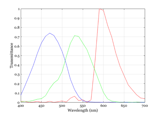% Make the sensor an XYZ type. For Foveon or other simulation, but in % different color filters. wave = sceneGet(scene,'wave'); filterFile = 'Foveon'; fSpectra = ieReadSpectra(filterFile,wave); %load and interpolate filters fSpectra = ieScale(fSpectra,1); filterNames = {'rX','gY','bZ'}; % Create a monochrome sensor. We will reuse this structure to compute each % of the complete color filters.] clear sensorMonochrome; for ii=1:3 sensorMonochrome(ii) = sensorCreate('monochrome'); %#ok<*SAGROW> sensorMonochrome(ii) = sensorSet(sensorMonochrome(ii),'pixel size constant fill factor',[1.4 1.4]*1e-6); sensorMonochrome(ii) = sensorSet(sensorMonochrome(ii),'exp time',0.1); sensorMonochrome(ii) = sensorSet(sensorMonochrome(ii),'filterspectra',fSpectra(:,ii)); sensorMonochrome(ii) = sensorSet(sensorMonochrome(ii),'Name',sprintf('Channel-%.0f',ii)); sensorMonochrome(ii) = sensorSetSizeToFOV(sensorMonochrome(ii),sceneGet(scene,'fov'),oi); sensorMonochrome(ii) = sensorSet(sensorMonochrome(ii),'wave',wave); end