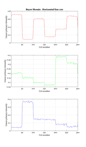 % Try zooming and comparing this one with the Triple % Well. Notice the difference in noise and the difference in mosaic ip = ipCompute(ip,sensorBayer); ip = ipSet(ip,'name','Bayer Mosaic'); ipWindow(ip); uDataB = ipPlot(ip,'horizontal line',[1 120]);