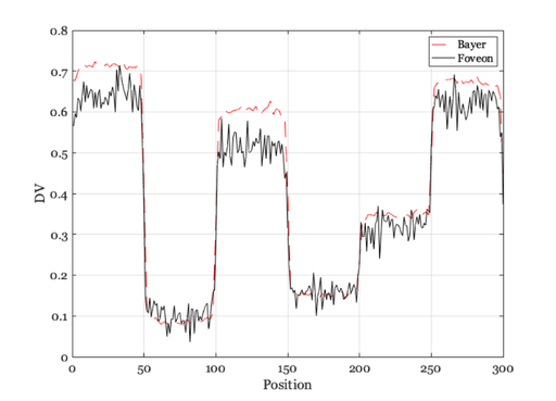 ieNewGraphWin; plot(uDataB.pos,uDataB.values(:,1),'r--'); hold on; plot(uDataF.pos,uDataF.values(:,1),'k-'); xlabel('Position'); ylabel('DV'); grid on; legend({'Bayer','Foveon'});