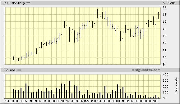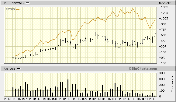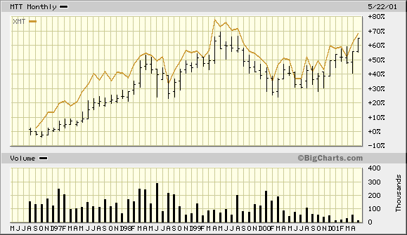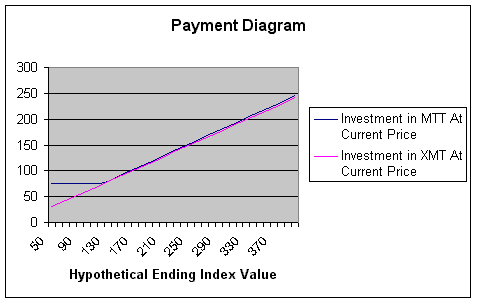 1.823 Diagram of payments for an investment of $100 (or 100 units of relevant currency) at the current price plotted with payments for an initial investment of $100 in the underlying index at its current price (Price of MTT as of 5/22/01: 16.30) (Price of XMT Index as of 5/21/01: 165.67)