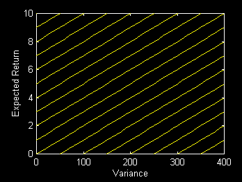 If an Investor's risk tolerance were the same at all points in a mean/variance diagram, his or her indifference map would be a family of parallel lines, as shown below:
