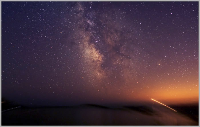| Comments: | The milky way in the constellation Sagittarius is home to many beautiful summer deep sky objects. We are also looking in the direction of the center of our galaxy. The center is believed to be about 30000 light-years away. The bright light trail on lower right is that of Seguin lighthouse along the Maine coast. The streaking is produced by the camera movement in tracking the stars during the roughly one hour of exposure. |